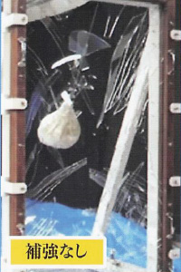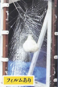 45kgの重りを振り子式にガラスに衝撃を加える飛散防止性能試験結果を実施。フィルムの有無によって、ここまで衝撃が異なります。